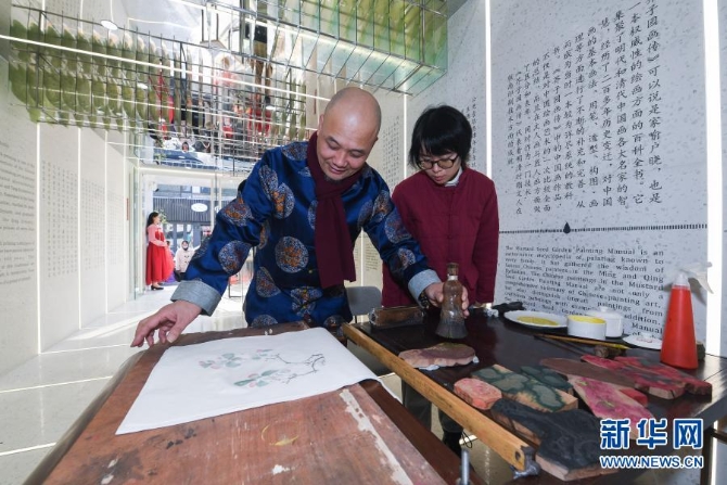 国家级非遗项目木版水印技艺代表性传承人魏立中(左)在位于杭州高银街的“木版水印”非遗新馆内指导徒弟创作木版水印作品(2020年12月22日摄)。新华社记者 徐昱 摄
