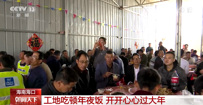 在海南海口江东新区的一个飞机维修项目工地,为了确保这个海南自贸港建设早期落地的重点项目今年3月完工,340多名工人坚守一线春节期间不停工。大年三十,项目部请留守在工地的工友吃了一顿丰盛的年夜饭。为了不影响工人晚上观看春晚,特意把年夜饭安排在除夕中午举行,让这些来自全国各地的农民工兄弟开心快乐过大年。(央视网)