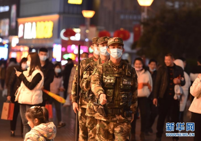2月11日,武警安徽总队合肥支队执勤十一中队官兵在合肥淮河路步行街巡逻执勤。新华社发(徐伟 摄)