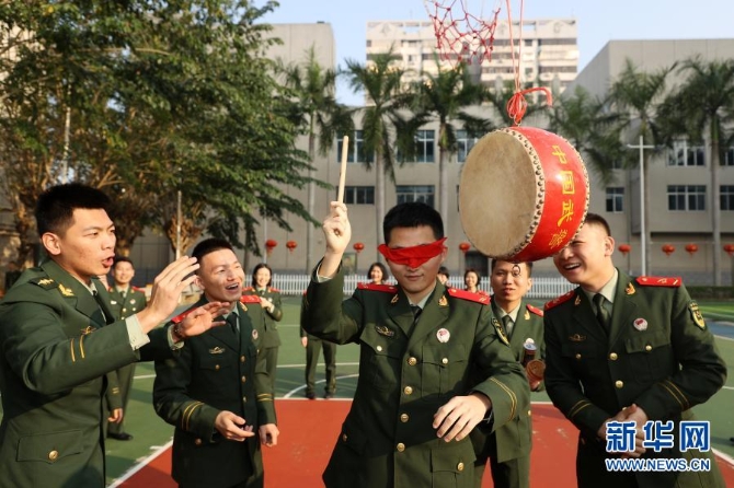 2月12日,武警海南总队某部官兵在游园活动中做游戏。新华社发(雷辙 摄)