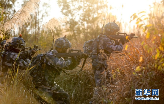 2月7日,海军陆战队某旅组织综合演练,陆战队员在芦苇丛中搜索藏匿的“敌人”。新华社发(贾成露 摄)
