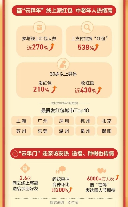 红包是过年最少不了的仪式感。支付宝数据显示,今年参与红包拜年上涨了267%,“红包”搜索量上涨了538%。长辈们也更爱在线上派红包了,六十岁以上中老年人发红包增长了210%,收红包增长了近430%。江浙沪、广东地区几乎包揽了最爱发红包的前十名。
