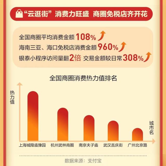 春节长假对消费的拉动作用,也辐射到了国内商超零售行业。全国热门商圈的支付宝交易金额平均增长108%,上海城隍庙豫园商圈比去年春节增长305%,仅次武汉吉庆街,排名全国第二,又以最旺盛的人气,成为全国最火爆的商圈,其余四名依次杭州武林商圈、南京夫子庙、武汉吉庆街、广州北京路。在昆明来说,同德广场、顺城仍旧热闹,新晋商圈恒隆春节期间客流量也不少。
