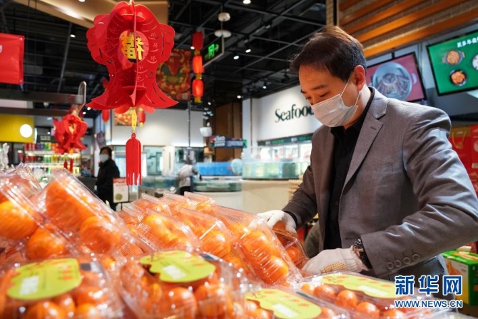 春节期间,某超市工作人员在码放水果。新华社记者任超摄