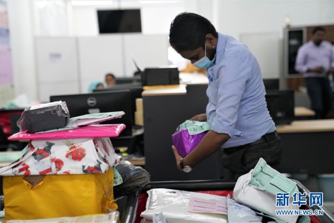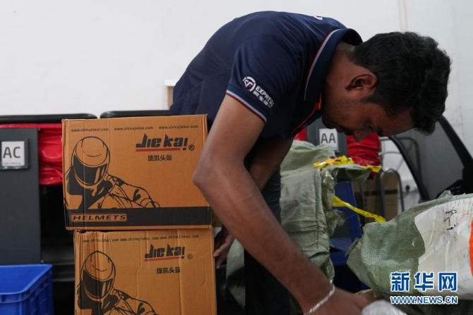 2月8日,斯里兰卡科伦坡一家当地跨境转运公司的雇员整理春节前从中国收到的一批货物。新华社 记者唐璐/摄