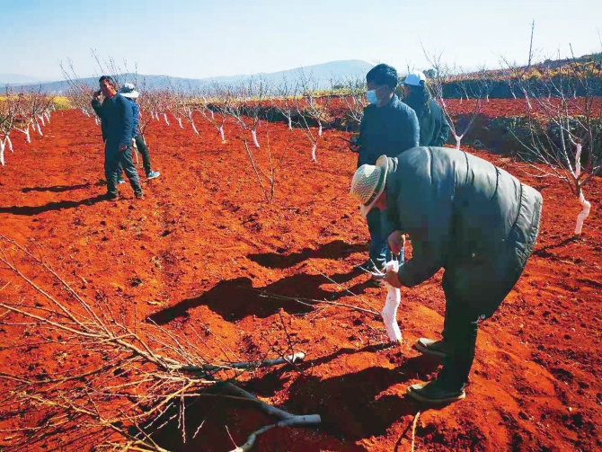 元谋县姜驿乡把产业扶贫作为脱贫攻坚“一盘棋”中的关键一子,构筑起全乡“八万五千”“一村一品”产业集群,实现了“大产业顶天立地,小产业铺天盖地”的发展态势。图为该乡农科人员在对560亩蜜桃进行嫁接。(李静)