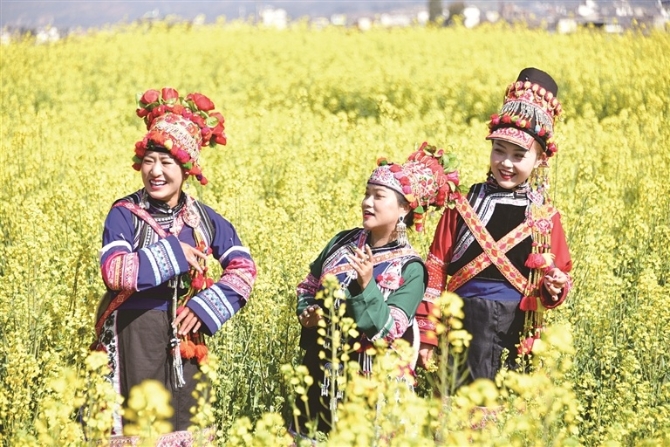 近年来,巍山县在实施乡村振兴战略中,积极发展油菜种植产业,既美化环境又助力农民增收。竞相绽放的油菜花与生态村庄相互衬托,构成一幅美不胜收的金色田园画卷。(记者陆向荣)