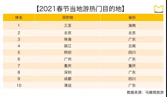 2021年,在各地“就地过年”的倡议之下,很多年轻人选择留在城市渡过春节假期。当地游、周边游成为人们在春节假期出行的热门之选。马蜂窝旅游大数据显示,春节假期期间,当地游热度排名前十的城市是:三亚、北京、珠海、丽江、广州、重庆、深圳、成都和清远。