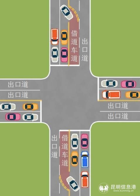 右转车辆驶入路口出口段时,应尽量靠右通行,将借道左转车道预留给左转车辆。