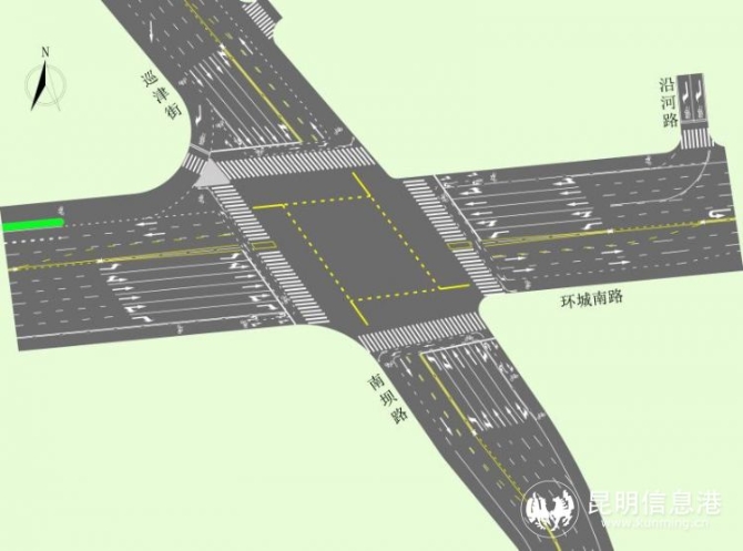 昆明信息港讯 记者合宇聪 19日,记者从昆明市公安局交通警察支队获悉,日前,昆明交警发布《关于双龙桥路口(环城南路与巡津街交叉口)交通调整后的通行提示》(以下简称《提示》)。该路口将进行“借道左转”试点工作,通过实施“借道左转”提高该路口左转交通转换能力。
