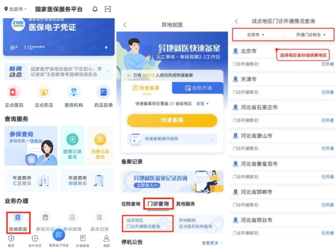 路径3:在主流应用商店下载并打开“国家医保服务平台”APP,点击“业务办理”中的“异地就医”,进入异地就医页面,点击“门诊查询”按钮,再点击“试点地区门诊开通地区查询”,可选择相应省份或统筹地区查看是否开通普通门诊费用跨省直接结算服务。
