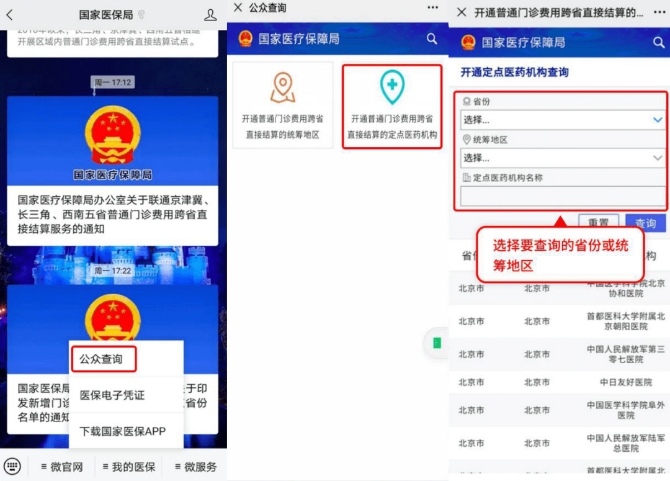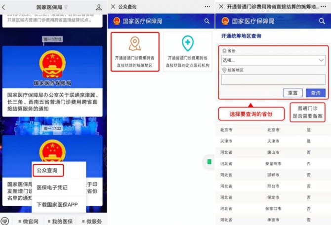 路径1:关注国家医保局公众号,点击下方导航栏中“我的医保”,选择“公众查询”,点击“开通普通门诊费用跨省直接结算的统筹地区”,选择您需要查询的省份后点击“查询”按钮,可搜索已开通的统筹地区。