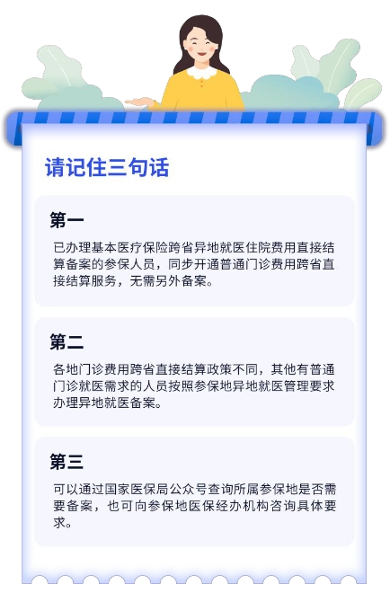 第二,各地门诊费用跨省直接结算政策不同,其他有普通门诊就医需求的人员按照参保地异地就医管理要求办理异地就医备案;