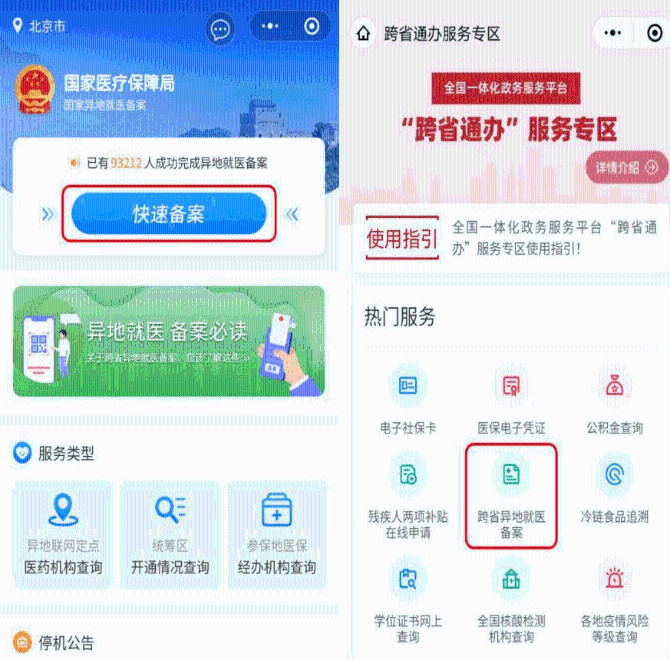 路径2:在微信小程序搜索“国家异地就医备案”,进入小程序完成“快速备案”。或者微信小程序搜索“国家政务服务平台”中“跨省异地就医备案”完成线上备案。