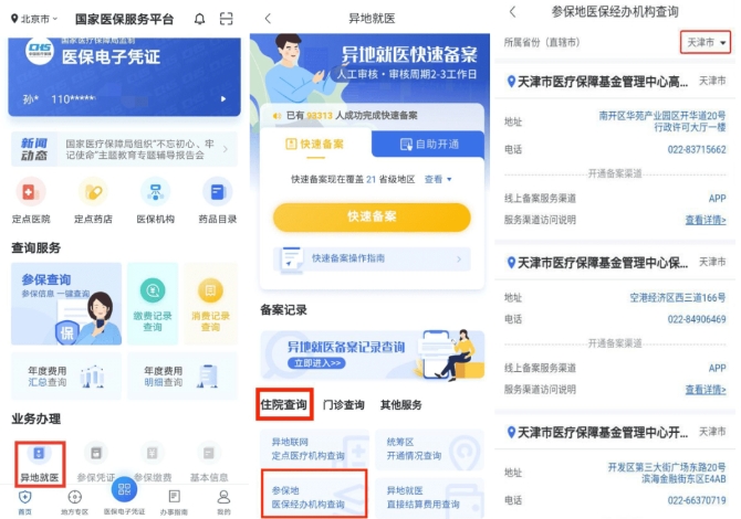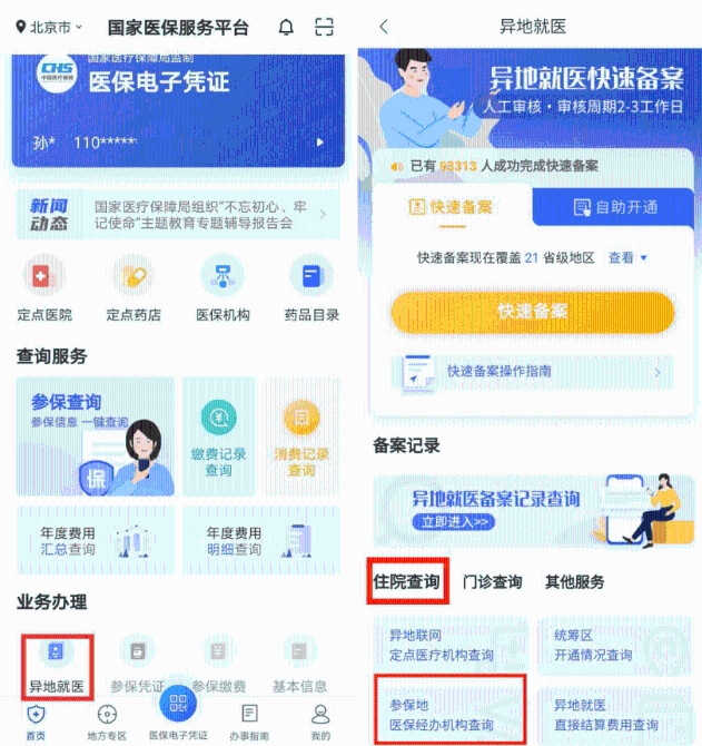 路径3:在主流应用商店下载并打开“国家医保服务平台”APP,点击“业务办理”中的“异地就医”-“住院查询”-“参保地医保经办机构查询”功能版块,了解所在参保地提供的线上备案渠道。