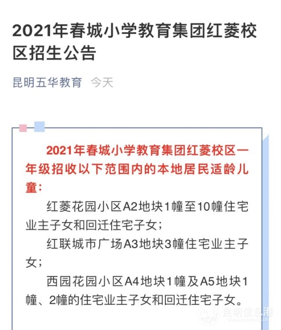 昆明信息港讯 记者上官艳君 2月21日,五华区教育体育局发布2021年春城小学教育集团红菱校区招生公告。