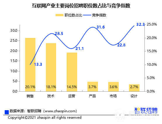 报告认为,互联网产业引导了全新的经济发展形态,这个以信息、知识、技术为主导要素的行业,在人才需求结构上也呈现出了差异化,产品、技术、运营、设计、市场和销售是互联网产业的6大主要岗位。