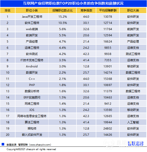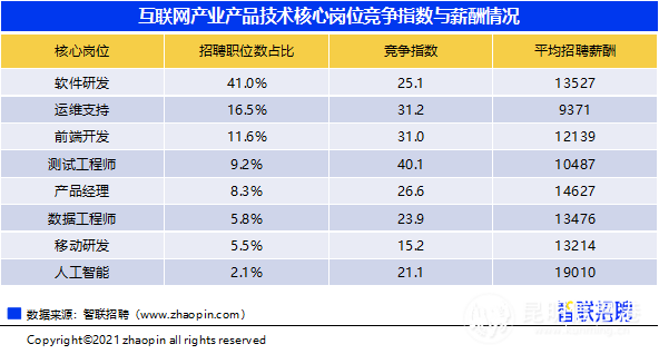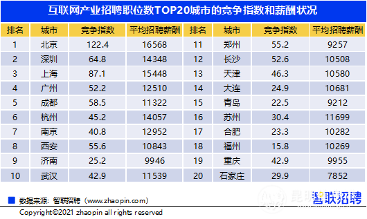 昆明信息港 记者江枫 智联招聘根近日发布《2021年互联网产业求职指南》,其中指出,互联网招聘需求中技术岗位占2成,产品、设计岗竞争激烈;软件研发人才需求最高,人工智能岗位高薪且处于竞争洼地;77%的人才需求集中在一线、新一线城市,北京、上海、深圳以高需求、高供给、高薪资成为三大热门城市。