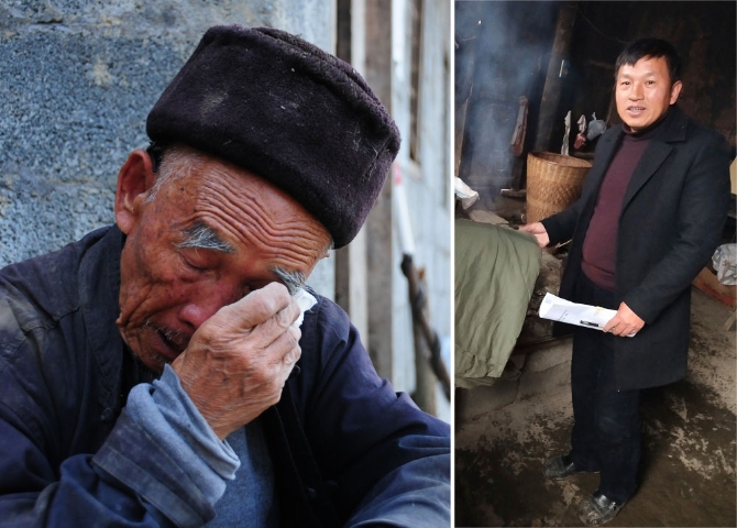 拼版照片:左图为2019年10月1日,贵州省铜仁市沿河土家族自治县中寨镇大坪村村民张信龙谈起文伟红时伤心落泪(新华社记者胡星摄);右图为2018年12月27日,文伟红在沿河土家族自治县中寨镇大坪村村民家中走访。新华社发