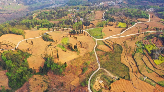 贵州省六枝特区大箐村的产业路四通八达,这里是倪裔豹驻村的“最后一岗”(2020年3月24日摄,无人机照片)。新华社记者 刘勤兵 摄