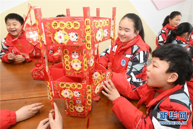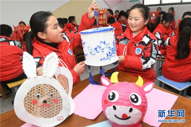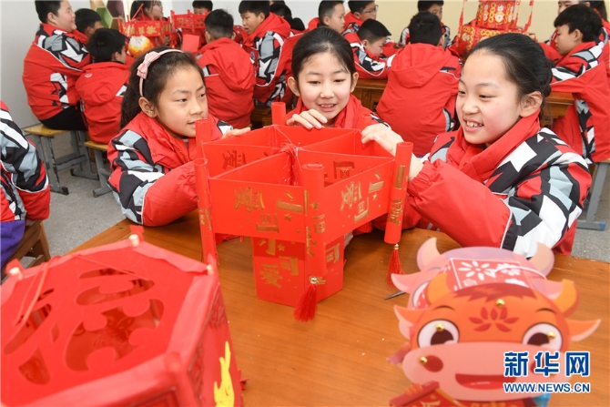 元宵节临近,安徽省阜阳市颍东区育新小学开展“自制花灯闹元宵”主题活动,组织小学生利用旧挂历、一次性筷子、旧饮料瓶、糖果盒、包装袋等材料,发挥想象,动手制作花灯。学生们制作的3000多盏花灯造型各异,惟妙惟肖,不仅让生活中的废旧物品变废为宝,同时也让他们了解了元宵节“闹花灯”的习俗,感受传统文化的魅力。新华网发(王彪 摄)
