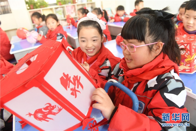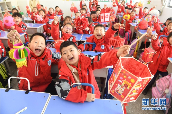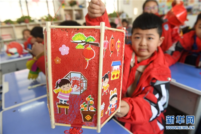 2月23日,安徽省阜阳市颍东区育新小学的小学生在展示制作的花灯。