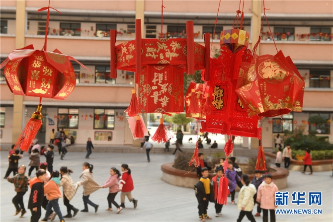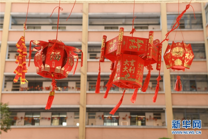 2月23日,安徽省阜阳市颍东区育新小学的小学生制作的花灯高高挂在校园内,洋溢着浓浓的喜庆气氛。