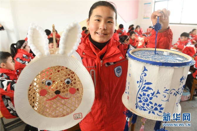 2月23日,安徽省阜阳市颍东区育新小学的小学生杨墨涵在展示制作的“青花瓷”花灯和“卡通兔子”花灯。