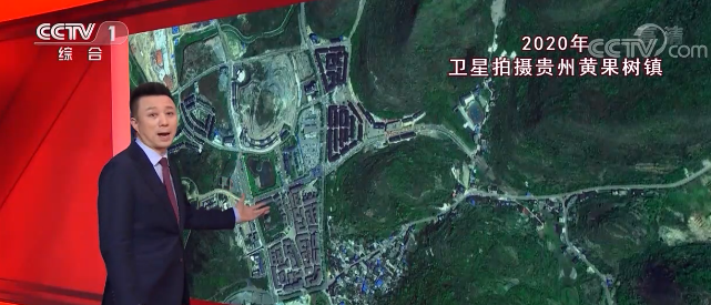 我们再看看贵州安顺市的黄果树镇。10年前,这里还只有一横一竖两条白色的县乡公路。10年后,公路变得密密麻麻。出山有了更多选择。这条是沪昆高速,由西南到东北跨省而过。卫星能看到的可不光是路。