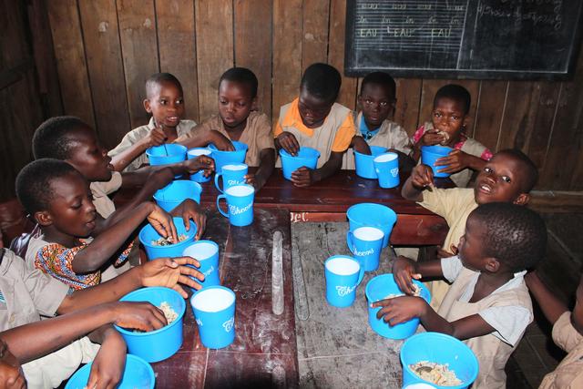 △2019年10月17日,在贝宁经济首都科托努郊区的托优优美小学,学生们在午餐时享用中国援助的米饭。从2018年开始参与中国、贝宁和世界粮食计划署联合实施的贝宁中小学生“全国学校食堂计划”后,该校的学生们每天都能吃上中国援助的大米饭。