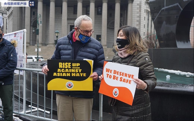 当地时间2月27日,美国纽约市多个亚裔团体发起反针对亚裔仇恨犯罪的抗议。当天下午在纽约市政厅附近,数百人参加了抗议活动。
