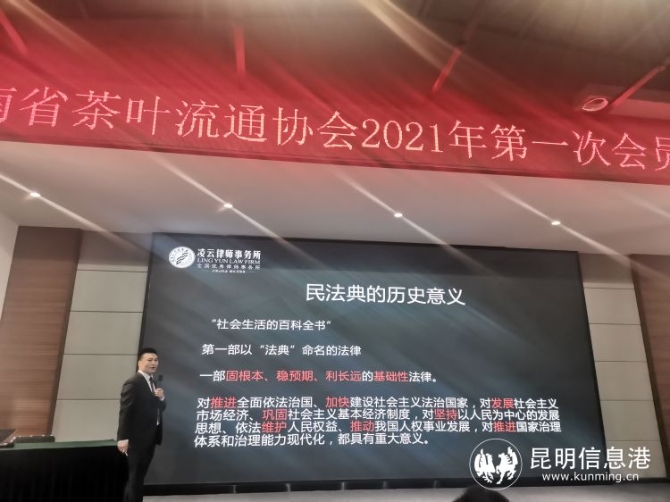 昆明信息港讯 记者李红鸾 为切实做好民法典学习贯彻工作,协助云南省茶叶流通协会会员学好、用好民法典,2021年2月28日,云南省茶叶流通协会举行2021年第一次双月活动日活动,活动携手协会法律顾问云南凌云律师事务所合伙人朱绍坤、部门副主任徐涛、唐瑞岭宣讲解读《中华人民共和国民法典》,护航企业发展。