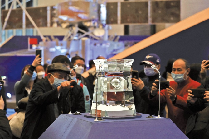 王春法在致辞中说,在我国脱贫攻坚战取得全面胜利的历史时刻,在“两个一百年”奋斗目标的历史交汇点,国博会同国家航天局联合举办这次展览,就是要以此庆祝中国共产党成立100周年,引领广大观众深入了解以探月工程为代表的科技创新重大成果,深入了解新型举国体制在推动重大科技创新中的重要作用,鼓舞全国人民敢于梦想、勇于创新、善于实干的奋斗士气,汇聚实现中华民族伟大复兴的磅礴力量。(记者卢旭)