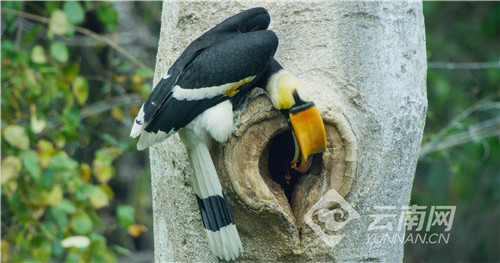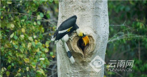 近日,自然生态摄影师尹以祜、曾祥乐、郑山河在云南省盈江县的“中国犀鸟谷”拍摄时,意外记录到了国家一级重点保护野生动物双角犀鸟雌鸟进树洞准备育雏时,用它的大嘴将“爱巢”洞口封闭缩小的影像。