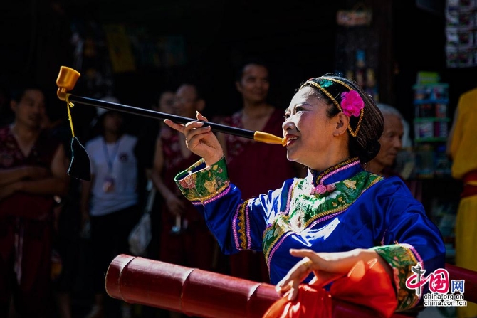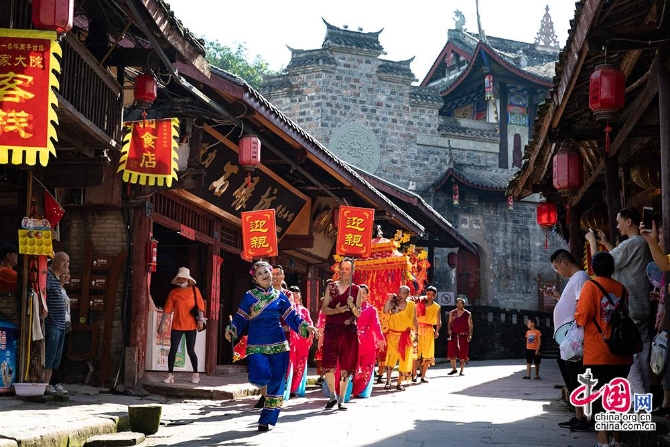 周子古镇隶属四川省南充市的蓬安县,为中国“辞宗赋圣”司马相如的故乡。它一面紧临嘉陵江,三面环依龙角山,像青龙一样逶迤而上,历经两千多年岁月涤荡而风采依然,成为嘉陵江上最后的古码头活化石。图为古镇上的民俗表演。中国网记者 董宁摄影