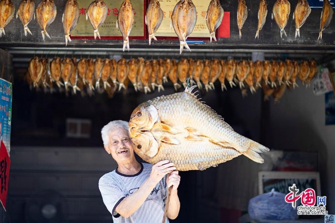 据记载,嘉陵江蓬安段有180多种鱼类,野生的鲫鱼、鲤鱼、鲢鱼、草鱼、青膳、翘壳、青波等等,其中最著名的是嘉陵江蓬安段里的特产石梁沱江团了。据悉,这种江团,下颌上有一点丹砂一般的红印迹,此鱼品尝起来肉质细嫩,味道鲜美,曾是历朝历代进贡朝廷的贡品。图为古镇商户展示嘉陵江内捕获的大鱼晾制的干货。中国网记者 董宁摄影