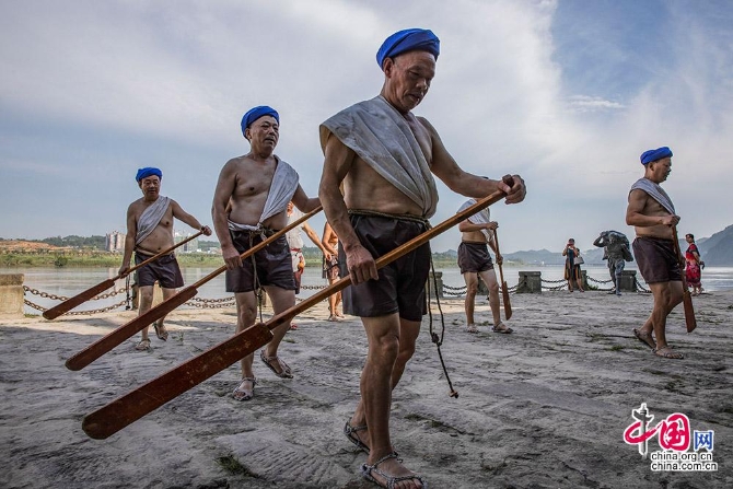 据介绍,周子古镇下码头,在40年之前还是非常热闹的,当时嘉陵江百船云集,船工号子响遏行云。图为演员在表演划船和拉纤,重现昔日情景。中国网记者 董宁摄影