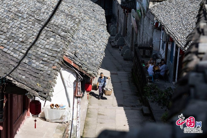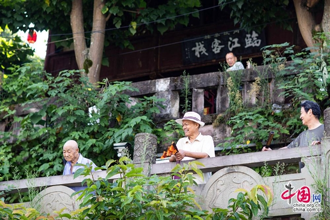 据说周子古镇以前热闹非凡,号子此起彼伏,挑夫络绎不绝,如今昔日热闹场景不在,随处可见的是很多老年人在这里悠闲的生活。中国网记者 董宁摄影