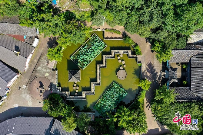 周子古镇三面环山,一面环水,被誉为嘉陵江的码头古镇,其历史已有1400多年。宋朝的理学鼻祖周敦颐因在此讲学,后人为纪念此事而建濂溪祠。濂溪祠位于古镇下河镇居委会后面,有戏台、正殿,所建的爱莲池虽面积不大,但池中青莲亭亭玉立。图为鸟瞰爱莲池。中国网记者 董宁摄影
