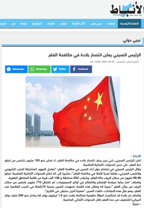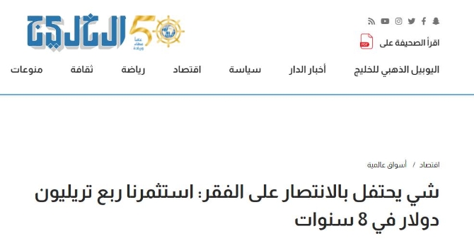 当天,阿联酋知名新闻网站“24.ae”发表了题为《中国国家主席:我们战胜了贫困》的文章。文章提到,自中国实行改革开放政策以来,已经有7.7亿人口摆脱了贫困。中国还在2012年制定了在2020年底前消除绝对贫困,提前10年实现《联合国2030年可持续发展议程》减贫目标的计划,目前这个目标已经实现。