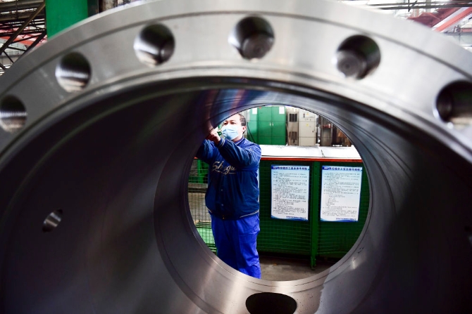 2020年2月10日,沈阳鼓风机集团股份有限公司工人在生产线上工作。新华社发(沈鼓集团提供)