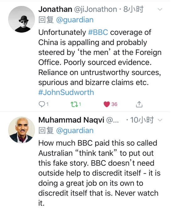网友乔纳森说:“很遗憾,BBC的涉华报道令人发指,而且很有可能是由英国外交部的‘人士’来指导的。他们的证据来源不充分,一向依靠不可靠的来源,以及虚假离奇的线索来造假。”