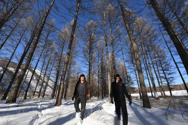 2012年,阿尔山实行国有林场全面停伐,已经当了十多年伐木工的两人,转变角色成为护林员。而随着当地旅游业、手工艺品加工业、特色养殖业等产业不断兴起,近年来,更多的昔日伐木工变身护林员、养殖户、手工艺人……成为绿色生态林业城市的建设者。这是护林员张明裕(左)和陈庆林在内蒙古自治区阿尔山市光顶山林场进行日常巡护工作(2018年1月10日摄)。