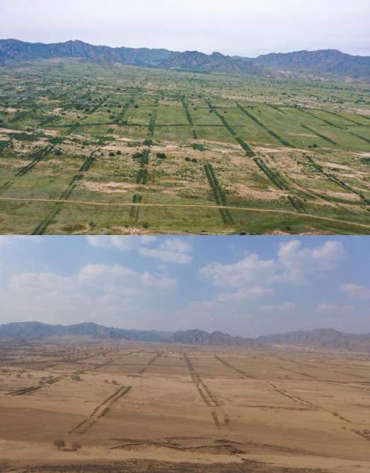 近年来,地处浑善达克沙地边缘的内蒙古自治区克什克腾旗经棚镇通过生态移民、禁牧封育、人工造林、工程固沙等治理措施,使土地沙化情况得到改善。拼版照片上图为在克什克腾旗西拉木伦河流域拍摄的一处经过治理的沙地(无人机照片,2020年8月12日摄);下图为沙地治理前的状况(2017年4月5日摄)。