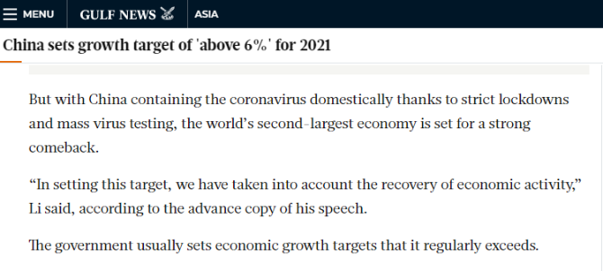 文章表示,5日两会政府工作报告中宣布,中国在2021年的经济增长目标为6%以上,并强调要努力推动改革、创新和高质量发展。文章还指出,在全球遭受疫情冲击的背景下,中国采取的抗疫举措卓有成效,作为全球第二大经济体,中国经济有望持续复苏。