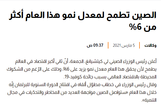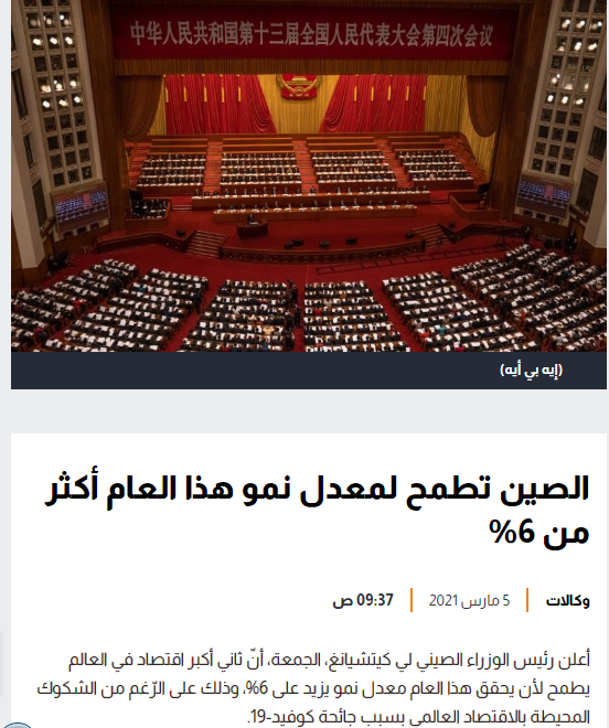 另外,阿联酋知名阿拉伯语报纸《观点报》在也当天发表题为《中国希望今年经济增长率超过6%》的文章,对今年两会进行了报道。