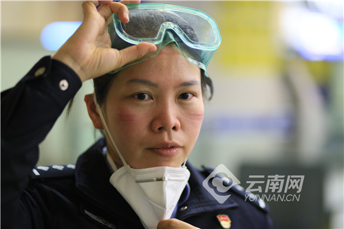作为边检执勤一线的”资深”组长,这些年她穿过的执勤鞋底基本都是磨烂的,袜子基本穿一轮班就顶通了。身旁的战友曾经计算过她的步数,勤务繁忙时,来来回回穿梭于各验证台、勤务督导台近百次,微信步数28万步,相当于12公里,有时一个航班验放完毕,她要足足站立台外4个多小时。购物车里,她存放最多的商品就是鞋垫、护膝和压缩袜,长年累月的长时间站立,丁组长的小细腿变成了“萝卜腿”已经很明显的出现了静脉曲张。“2020年受新冠疫情影响,昆明机场的出入境客机流量较往年锐减,但货机却比以往多了很多。”今年的大年初三,正值丁嫚莉负责入境夜班,她一夜没睡办理了7次机组出入境手续,往来机坪7次进行货机清仓检查,防护服一穿就是一整夜,第二天清晨下班才发现由于长时间戴护目镜和口罩,脸上除了两道醒目的勒痕,皮肤也过敏了。“我们这些都是常态,身边每名同志都会经历,惟愿祖国山河锦绣,国泰民安。”说到此,丁嫚莉的脸上绽放出了笑容。