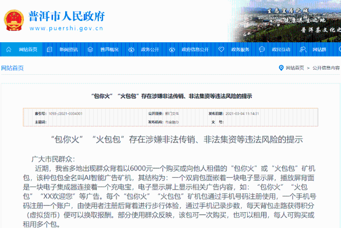 据云南省普洱市人民政府网站3月4日消息,普洱市防范和处置非法集资工作领导小组办公室当天发布了《“包你火”“火包包”存在涉嫌非法传销、非法集资等违法风险的提示》。