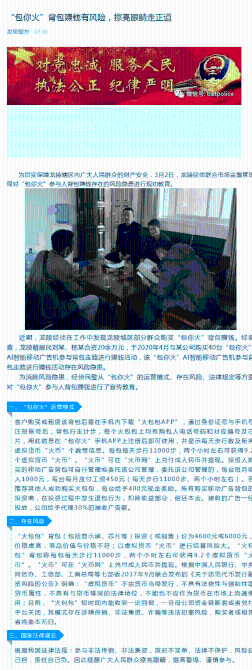 经公安机关研判,“包你火”“火包包”短时间确实能收到一定回报,一旦母公司资金链断裂,购买者或租赁者将血本无归。该模式存在涉嫌非法传销、非法集资、非法吸收公众存款、诈骗等违法犯罪风险。