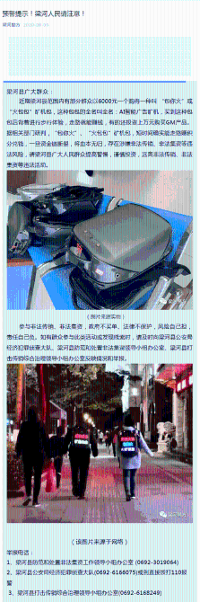 这份违法风险提示称,近期, 云南省多地出现群众背着以6000元一个购买或向他人租借的“包你火”或“火包包”矿机包,该种包包全名叫AI智能广告矿机,其结构为:一个双肩包面嵌着一块电子显示屏,播放屏背面是一块电子集成器连接着一个充电宝,电子显示屏上显示相关广告内容,如:“包你火”“火包包”“XX欢迎您”等广告。
